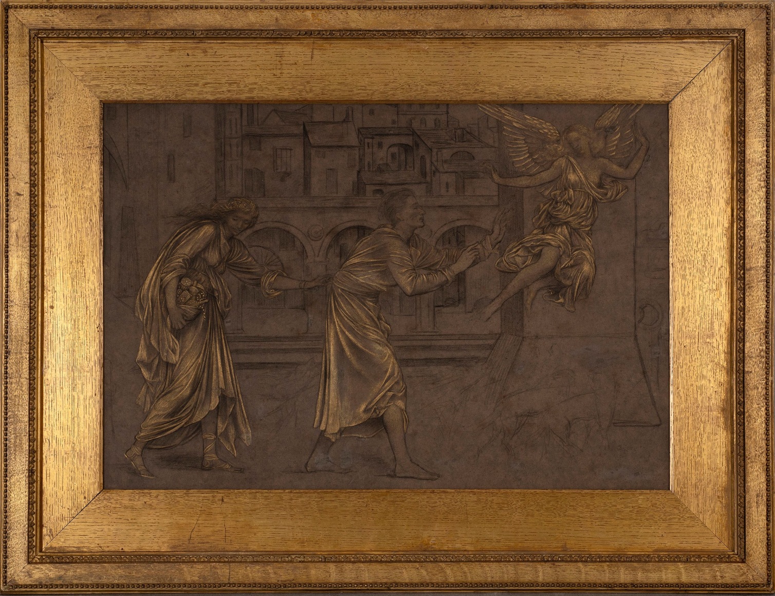 Gold coloured pastel and black chalk on dark grey-brown wove paper contemporaneously laid down on backing board (likely by the artist or the artist’s sister)
